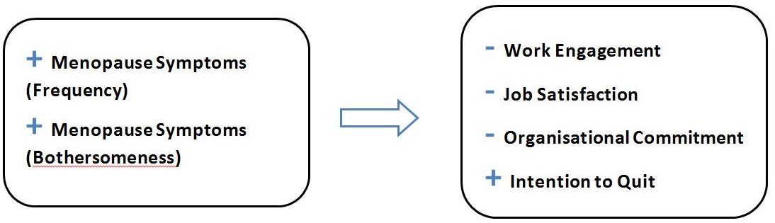 However, the relationships between menopause and work were then analysed further, by examining the relationships between the frequency and bothersomeness of menopause-related symptoms and the four work outcomes (work engagement, job satisfaction, organisational commitment and intention to quit). The findings from these analyses are reflected in Figure 2 below.